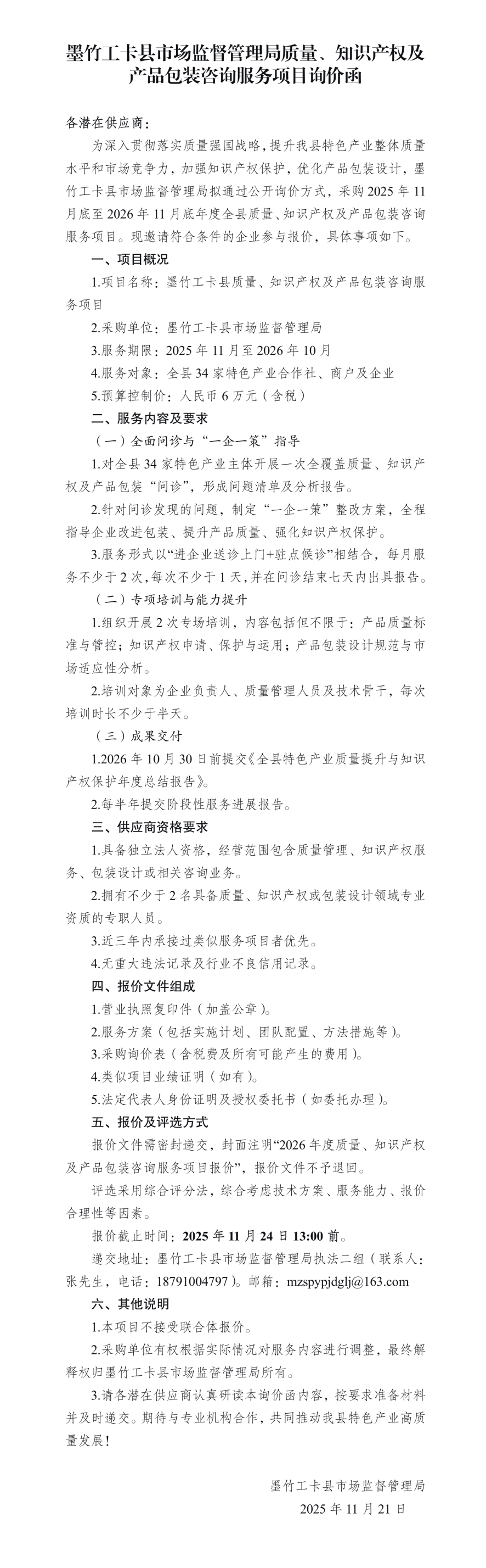 墨竹工卡县市场监督管理局质量、知识产权及产品包装咨询服务项目询价函