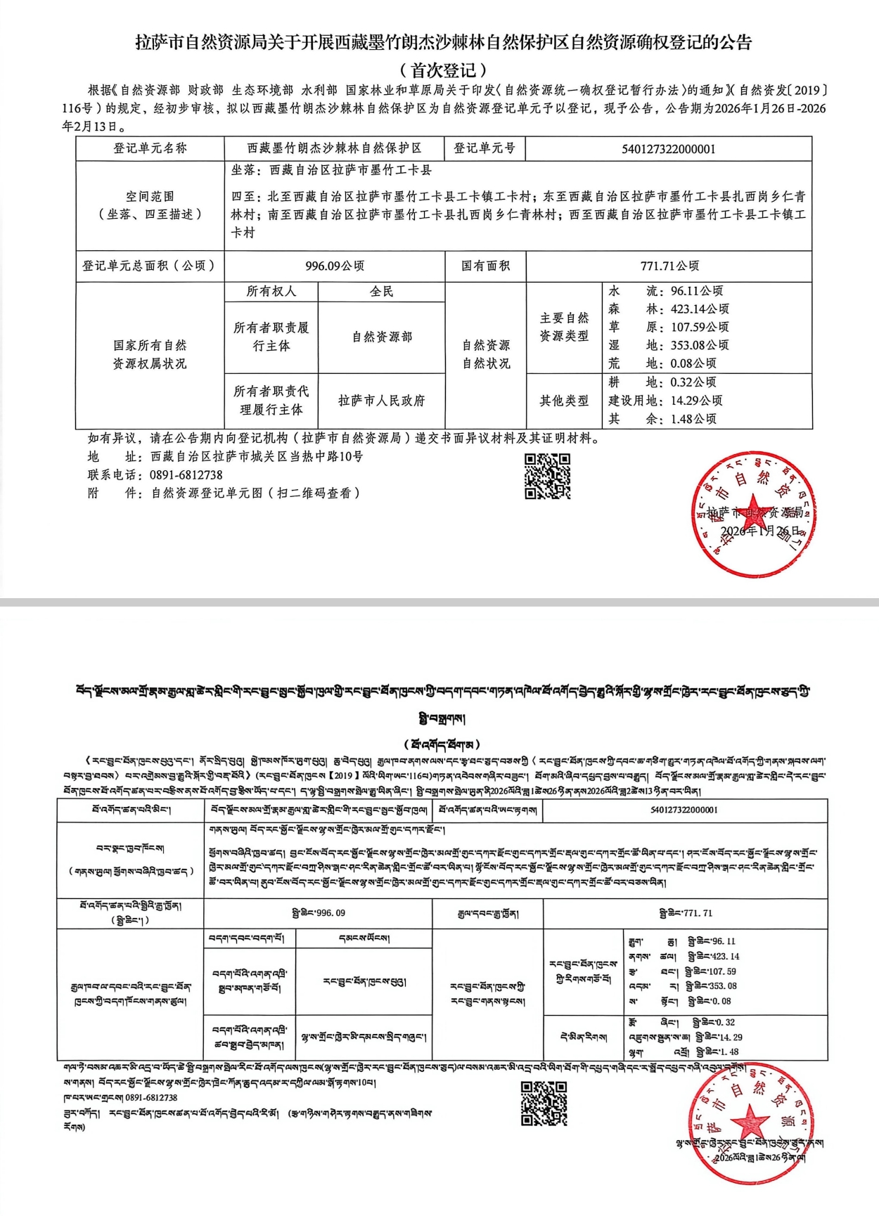 拉萨市自然资源局关于开展西藏墨竹朗杰沙棘林自然保护区自然资源确权登记的公告