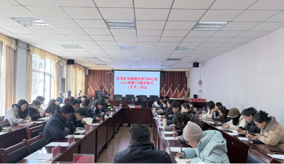 为持续抓好作风建设,以过硬作风护航新一年各项工作开好局、起好步,1月15日,扎雪乡组织召开2026年第1次党委理论学习中心组集中学习(扩大)学习会。乡党委副书记、乡长汤进柏同志主持会议,乡党委理论学习中心组成员、乡派出所所长、卫生院负责人、各村书记、第一书记、在家乡干部等参加会议。